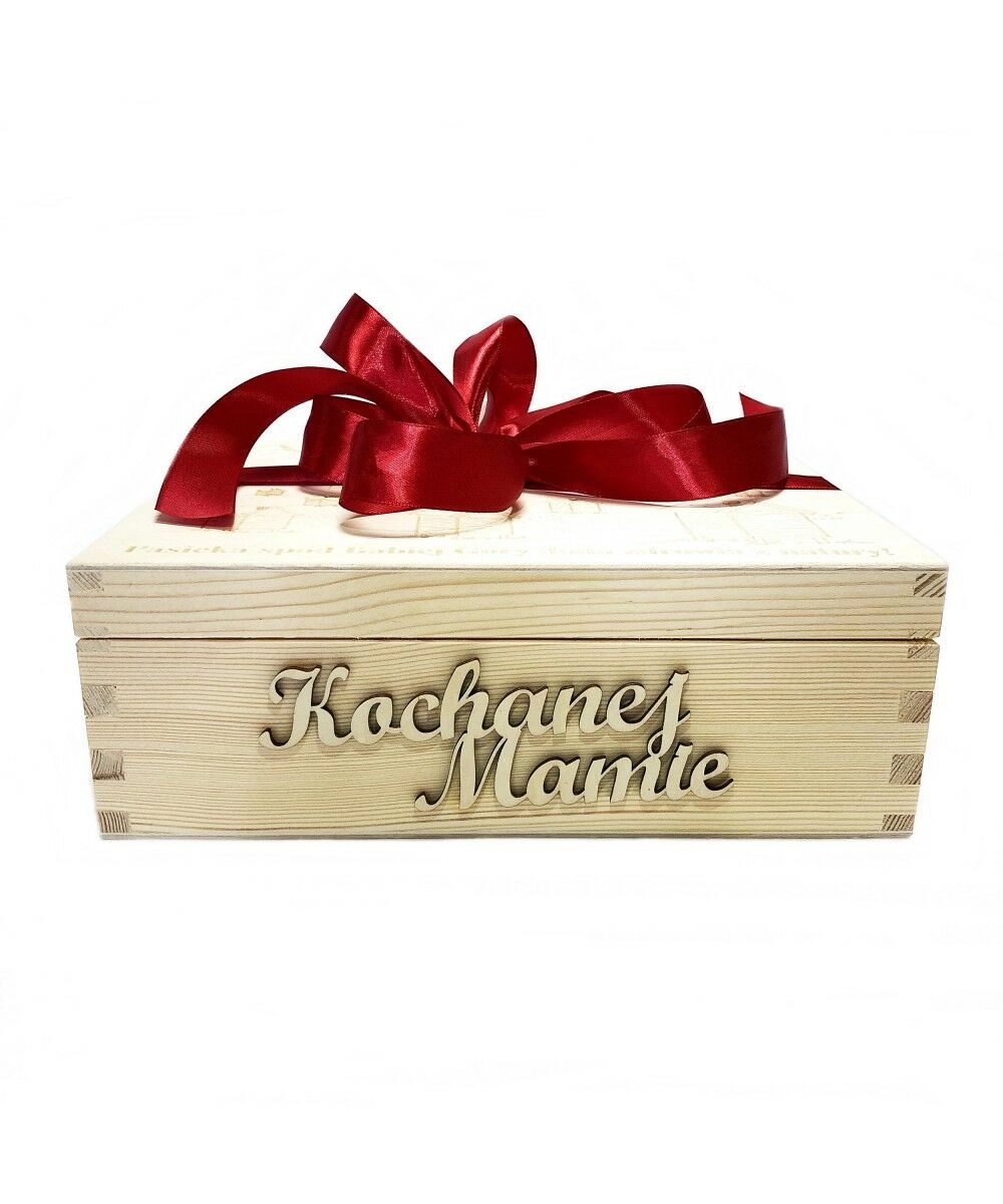 Całość w eleganckiej drewnianej szkatułce z firmowym grawerem oraz drewnianym napisem „Kochanej Mamie”.
