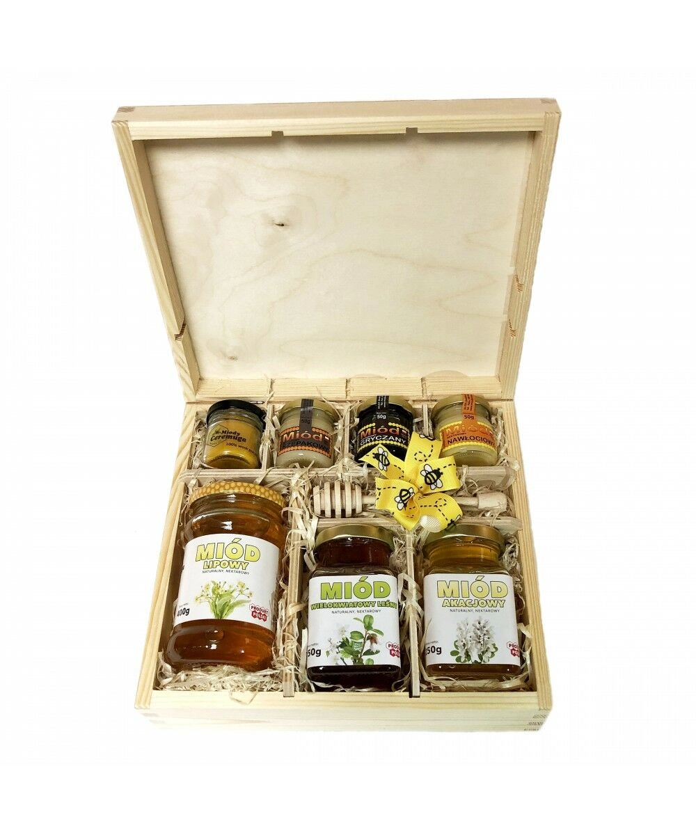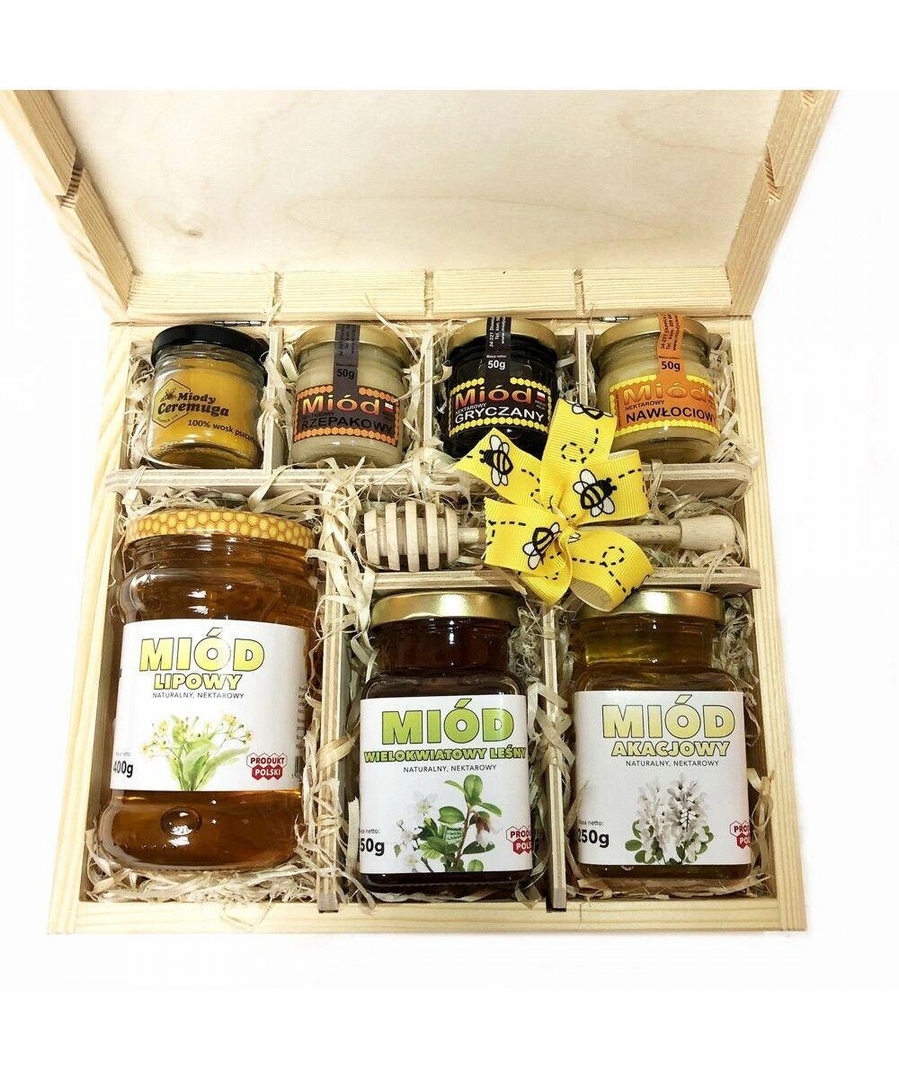 Zestaw firmowy naszej pasieki! Prezent składa się z miodu lipowego 0,4 kg, wielokwiatowo-leśnego 0,23 kg, akacjowego 0,23 kg, rzepakowego 50g, gryczanego 50g, nawłociowego 50g oraz świecy z naturalnego wosku pszczelego (40ml).