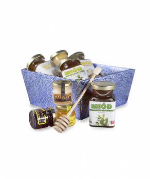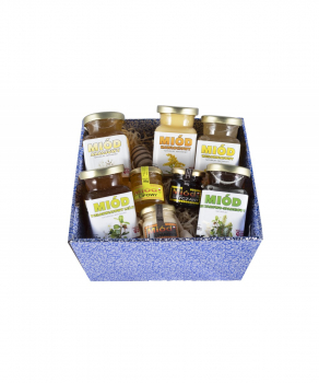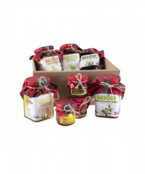 Zestaw zawiera 8 naturalnych miodów – 5 po 230g oraz 3 po 50g.