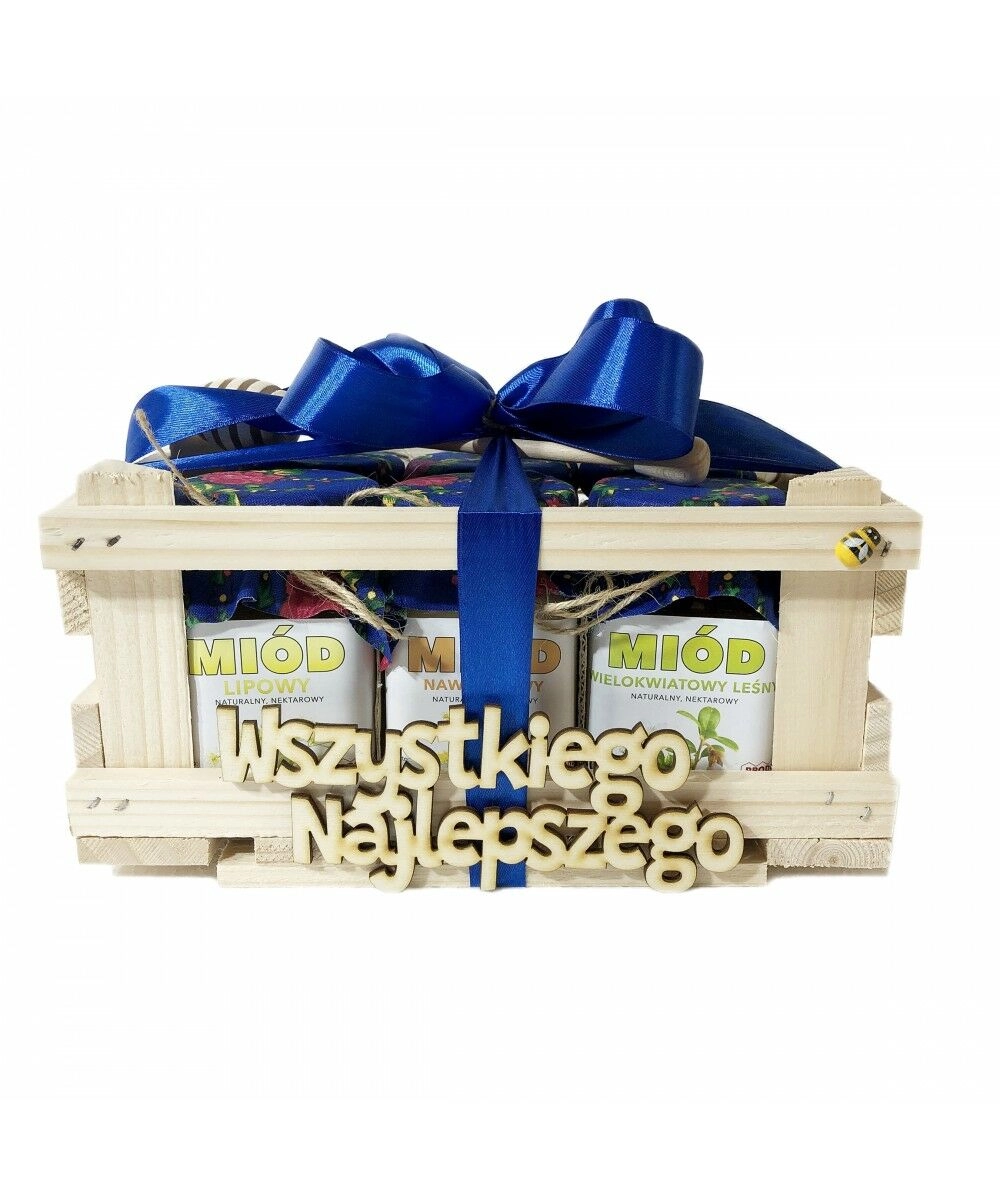 Wszystkie miody są ubrane ozdobnym niebieskim materiałem i spakowane do drewnianej skrzyneczki.