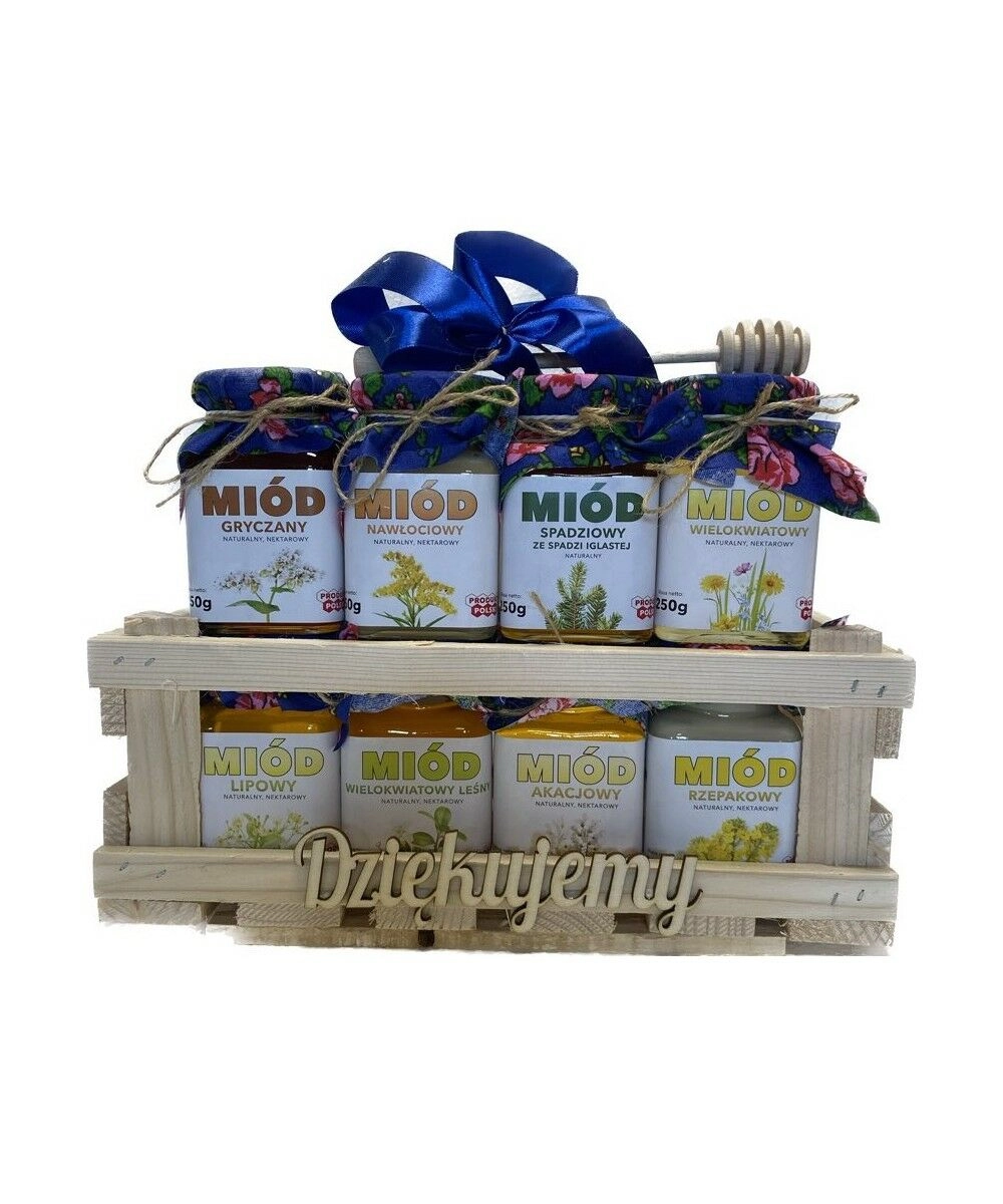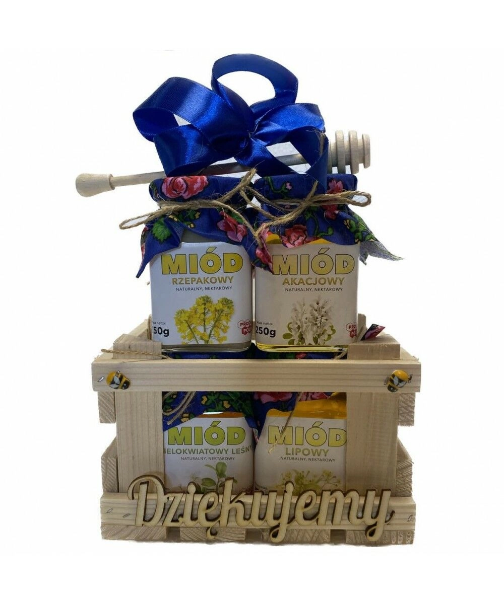 Całość spakowana w drewnianej skrzynce z drewnianym napisem „Dziękujemy” i zawiązana ozdobną wstążką. Drewniana pałeczka do nakładania miodu gratis.