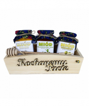 Całość spakowana w drewnianej skrzynce z drewnianym napisem „Kochanemu Tacie” i zawiązana ozdobną wstążką. Drewniana pałeczka do nakładania miodu gratis.