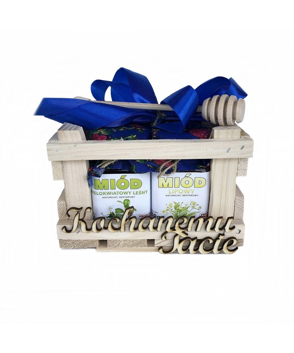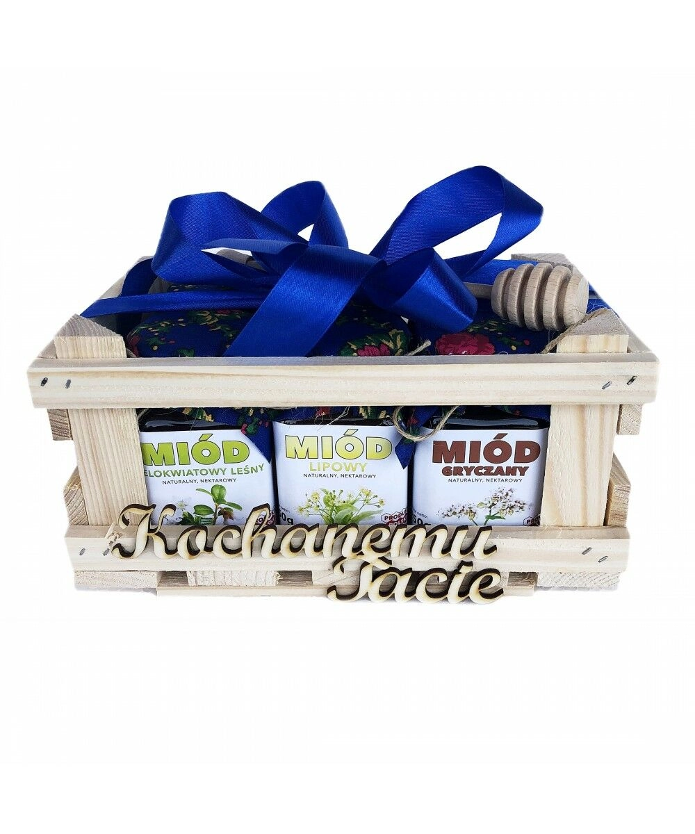 Całość spakowana w drewnianej skrzynce z drewnianym napisem „Kochanemu Tacie” i zawiązana ozdobną wstążką. Drewniana pałeczka do nakładania miodu gratis.
