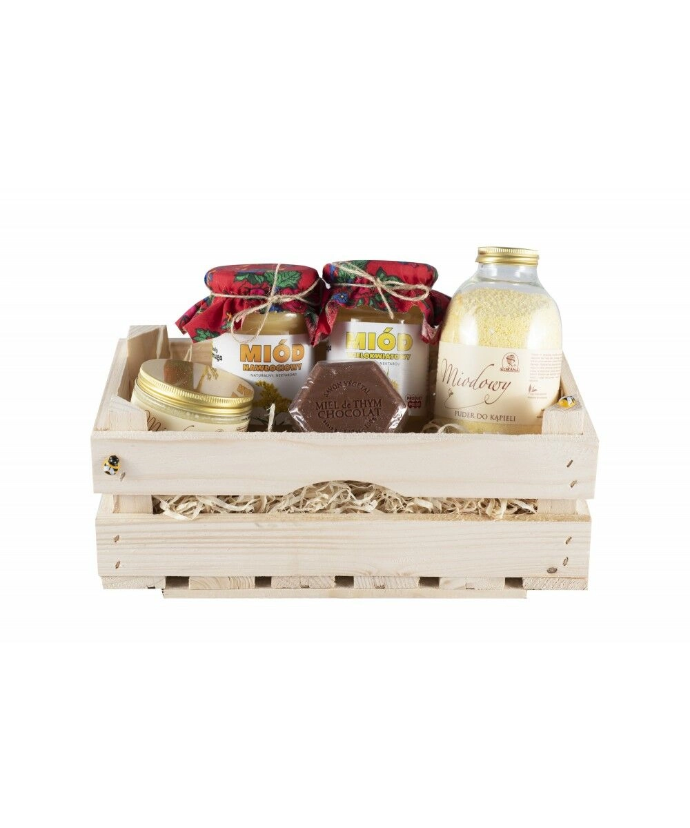 Całość spakowana jest w drewnianej skrzynce, zawinięta przezroczystą folią i zawiązana ozdobną wstążką.